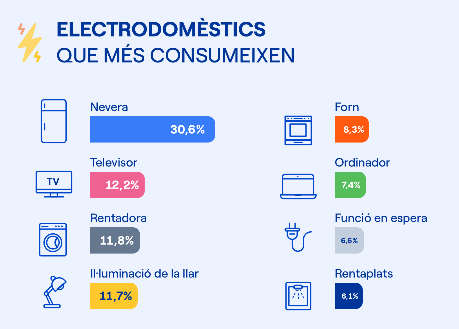 I si analitzem la demanda de cadascun dels aparells? Els frigorífics consumeixen un 30,6%, mentre que els congeladors representen un 6,1%. Les rentadores representen l'11,8%, mentre que els rentaplats el 6,1% i les assecadores el 3,3%. El forn consumeix un 8,3% de l'energia. Les pantalles com els televisors es mantenen en un 12,2%, i els ordinadors en un 7,4%. El consum en espera representa el 10,7% de la demanda, i altres electrodomèstics el 3,5%.