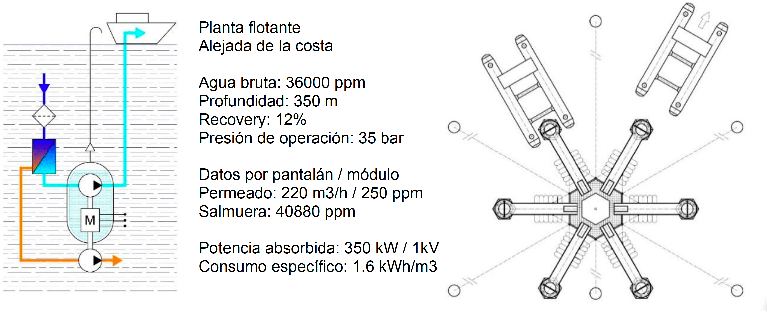 - Cuentan con módulos desalinizadores suspendidos de pantalanes flotantes, permitiendo una capacidad de producción significativa (30,000 m³/día).